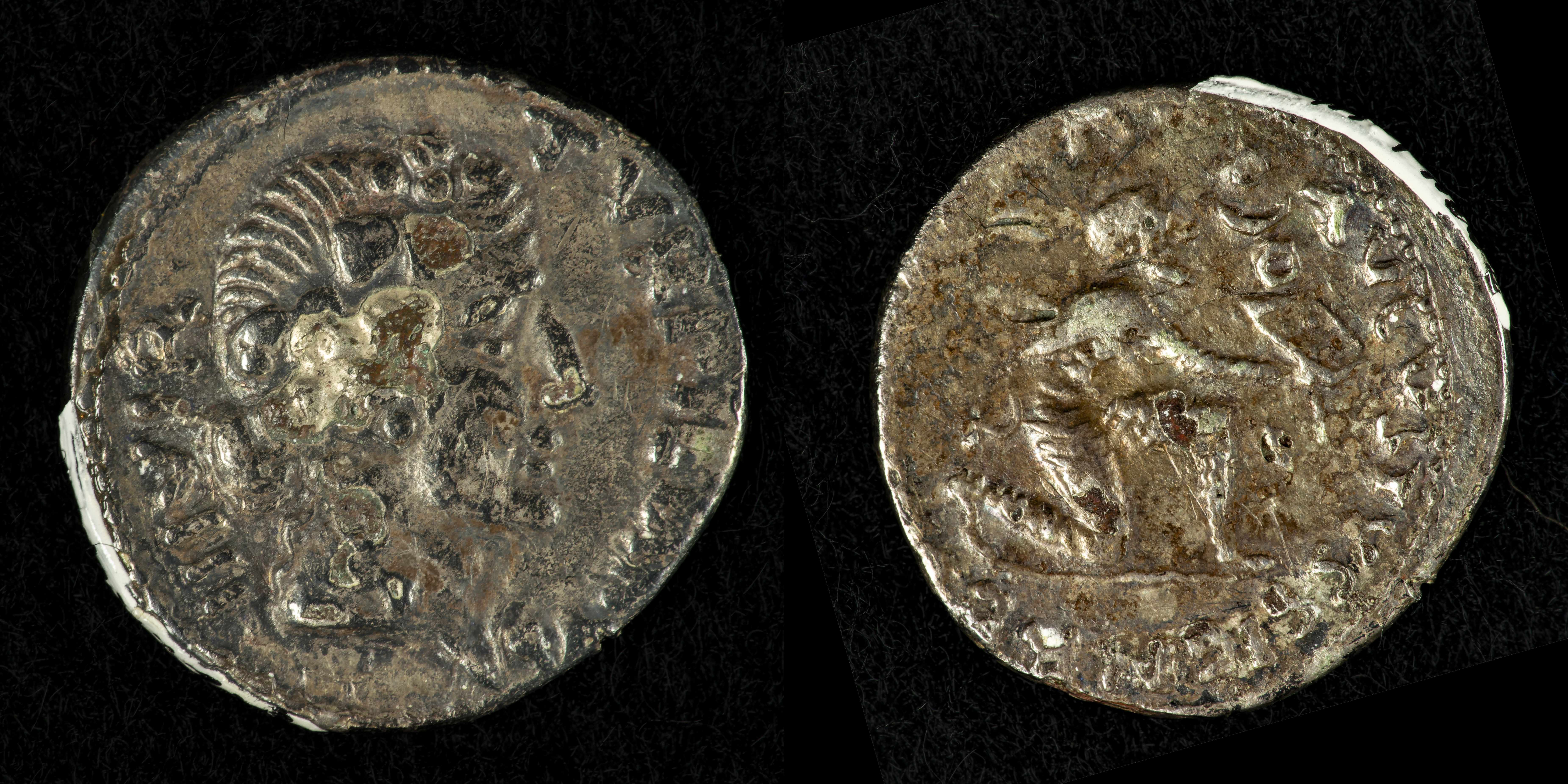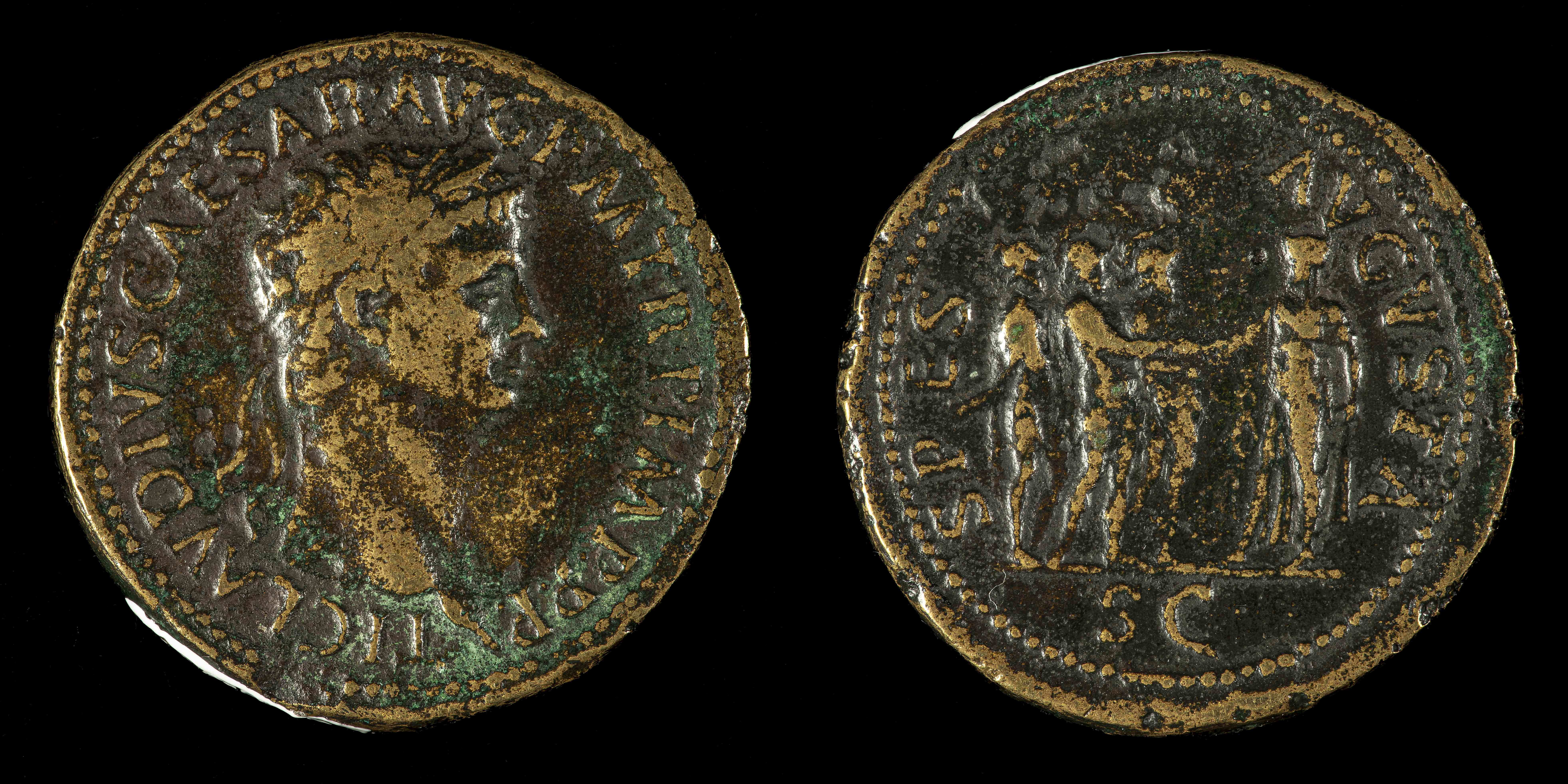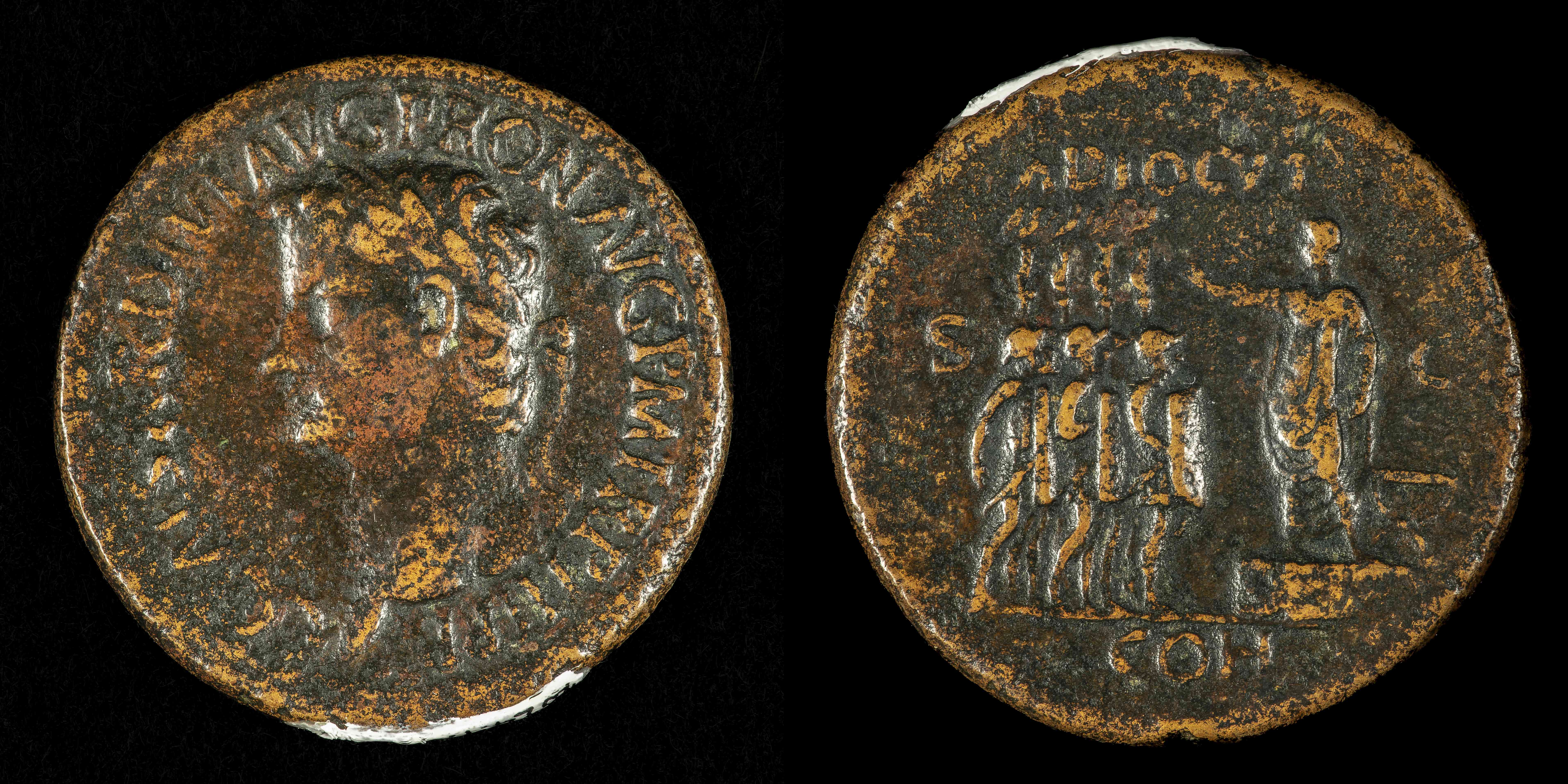 Next, we have two fantasy coins that are Renaissance-era imitations of Roman coins. These so-called “Paduans” were created by Giovanni Cavino with fellow artists and students in Padua in the mid-1500s2. Debate is open as to whether these were intentional forgeries or simply artistic challenges. Given the artistic skill involved, these objects are more challenging to debunk. The Caligula “sestertius” is a near perfect copy of a known coin (RIC I2 Gaius 40), however, authentic coins do not have the S-C across reverse field as in our example. Similarly, the Claudius “sestertius” has a correct obverse (RIC I2 Claudius 115) but the reverse design does not appear until 20 years later in the reign of Vespasian (RIC II2.1 Vespasian 206). For additional references see3.
