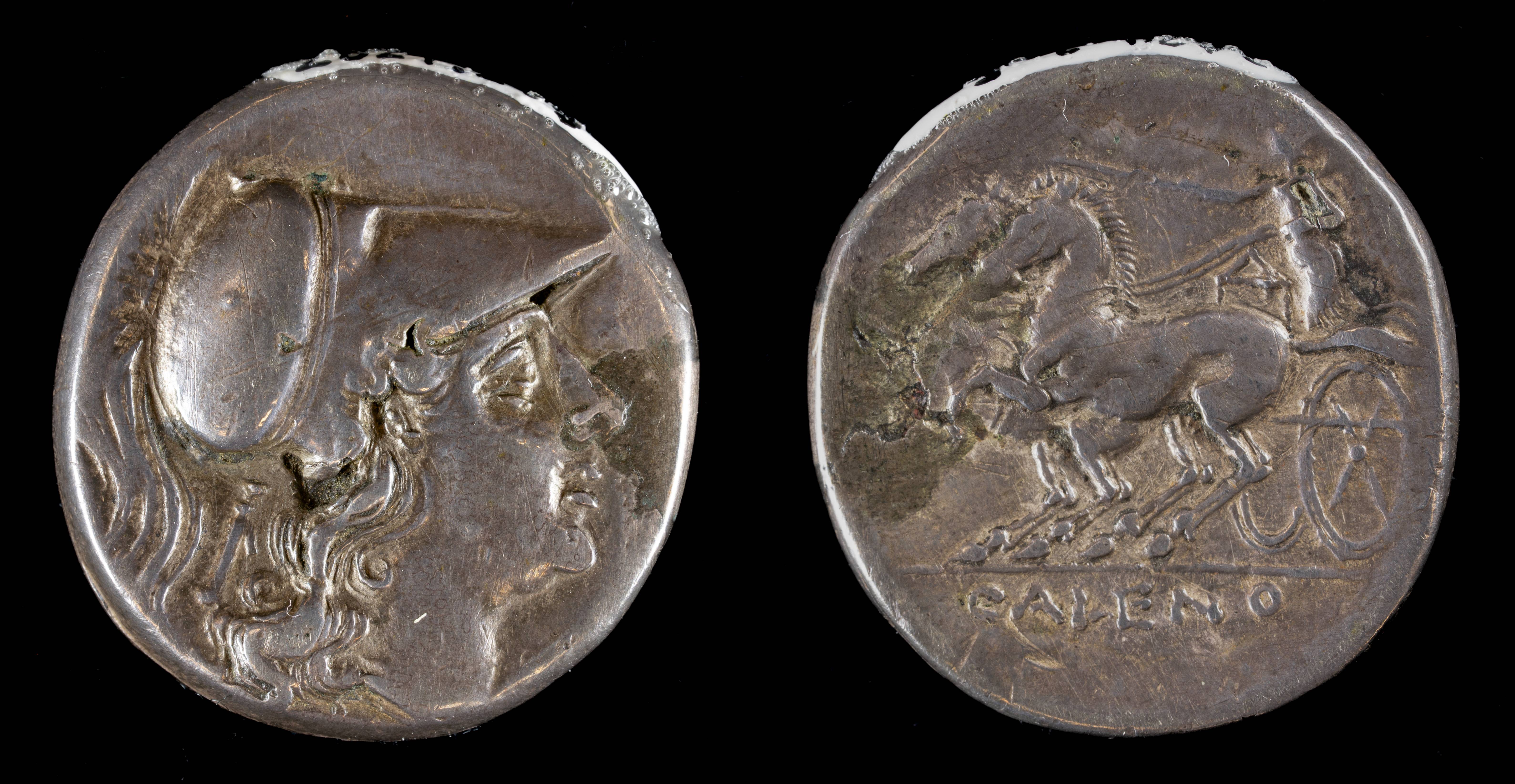 The “diadrachm” of Cales below is a clear fourree. Several aspects give the coin away. The coin is underweight at 6.80g instead of the expected 7.3g, and there is light doubling on the obverse. Multiple cracks in the flan can expose the inner copper core. Finally, the coin is revealed as having a copper core via X-ray analysis. Additionally, this coin has been condemned by NGC.