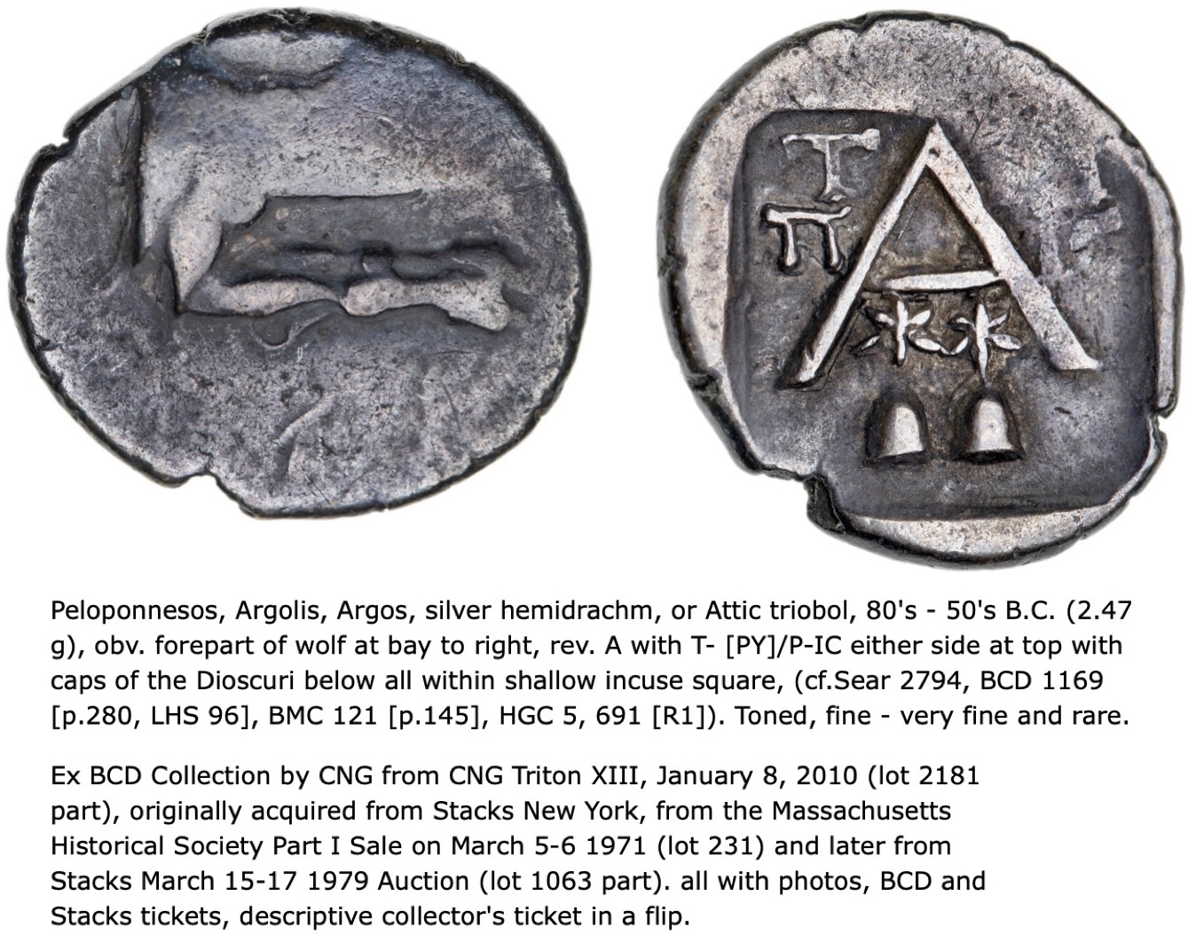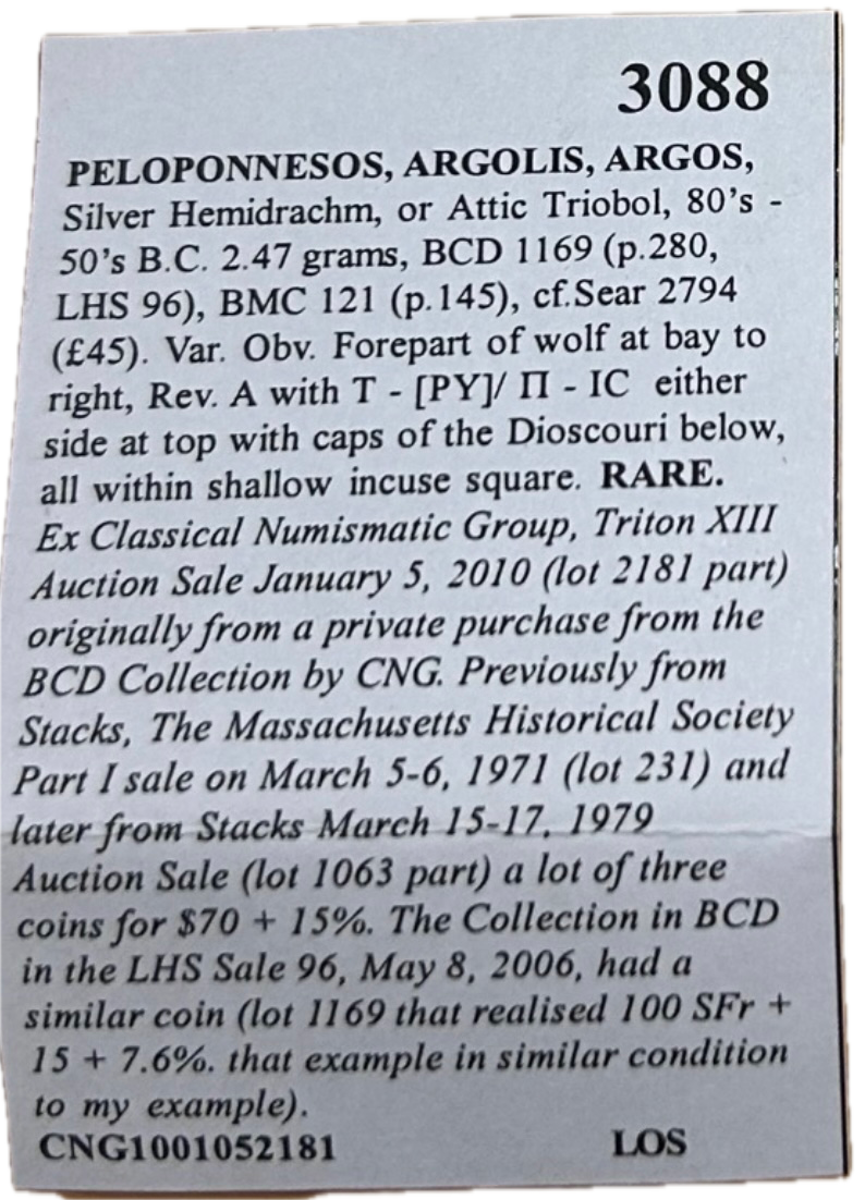 The Madison Art Collection has successfully reacquired Lot 1063 from the Dr. John Sawhill Collection! This hemidrachm of Argos has a storied ownership, being part of the President John Quincy Adams and Descendants Collection and the BCD Collection, one of the largest ancient Greek collections ever formed.