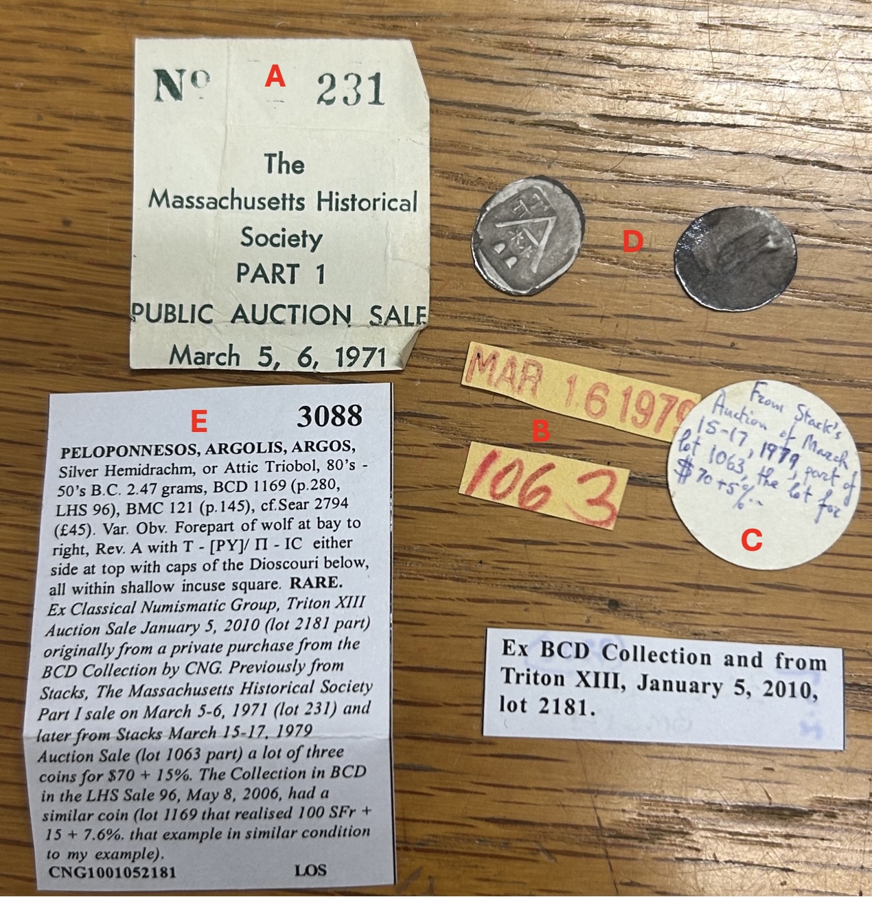 - BCD dispersed the major pieces of his collection over 10 sales starting in 1996. Minor or duplicate coins were later sold in various auctions. Our coin appeared in 2010 in a group of 82 coins as Lot 281 in CNG Triton XII. The unknown purchaser, whose coin we just acquired, created their own tags summarizing the provenance above.