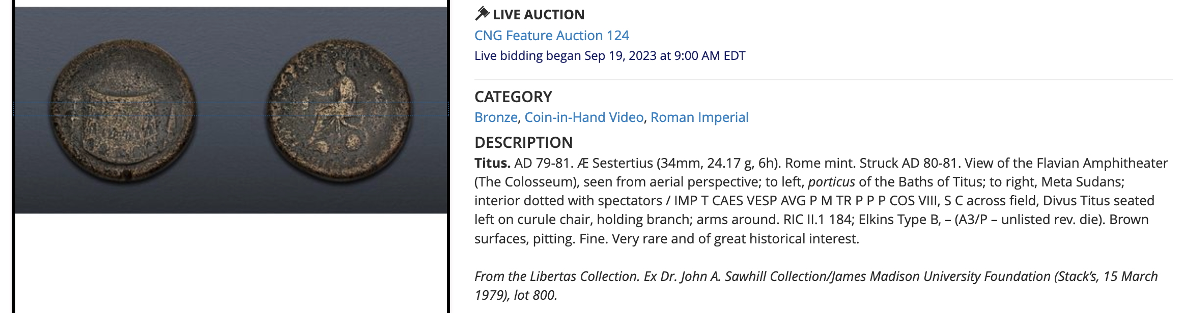 While a boon to collectors, the sale of Sawhill’s collection represents a distinct cultural and academic loss for James Madison University. In order to better understand our past and protect our future, the Recovering Sawhill Project seeks to track the major collections and sales in which Sawhill coins have appeared. Below is a table enumerating our latest research in finding these objects. Lot numbers containing a decimal point indicate a particular coin within a multi-coin lot. For example, lot 98.2 refers to the second coin in lot 98, which originally contained four coins.